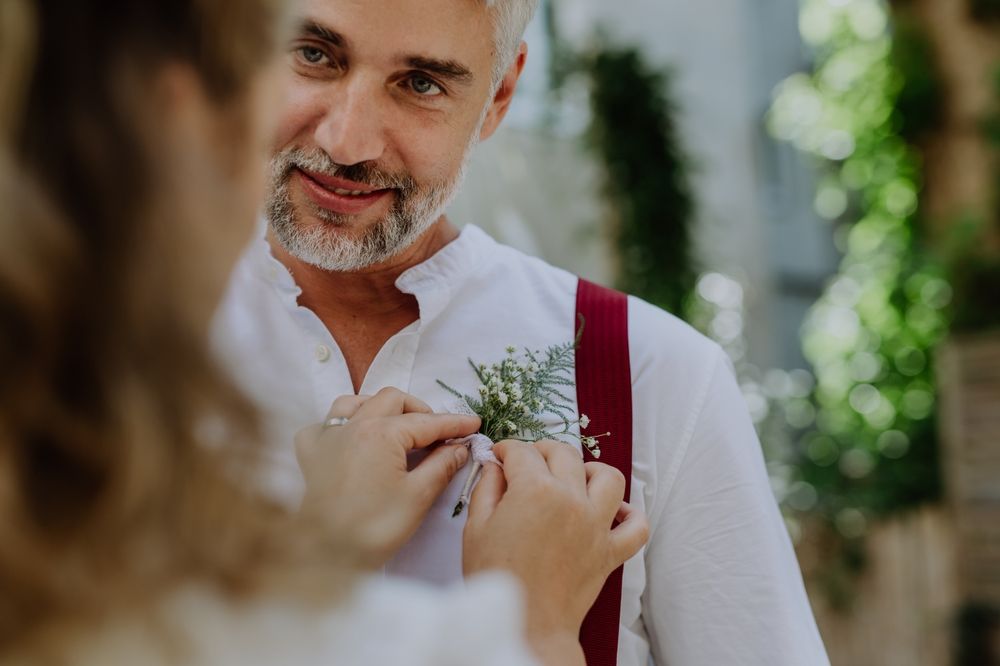 Hoe de bruidegom met zijn kostuum subtiel kan aansluiten bij de trouwjurk
