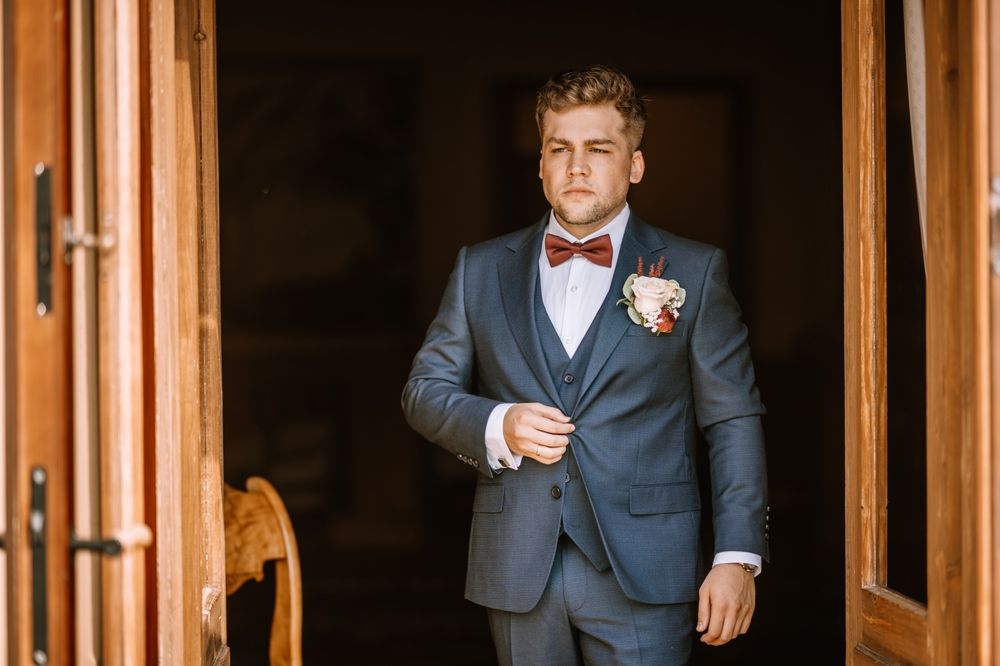 - Kleur, stof, afwerking en accessoires van de bruidegom creëren harmonie in de foto’s en video’s.