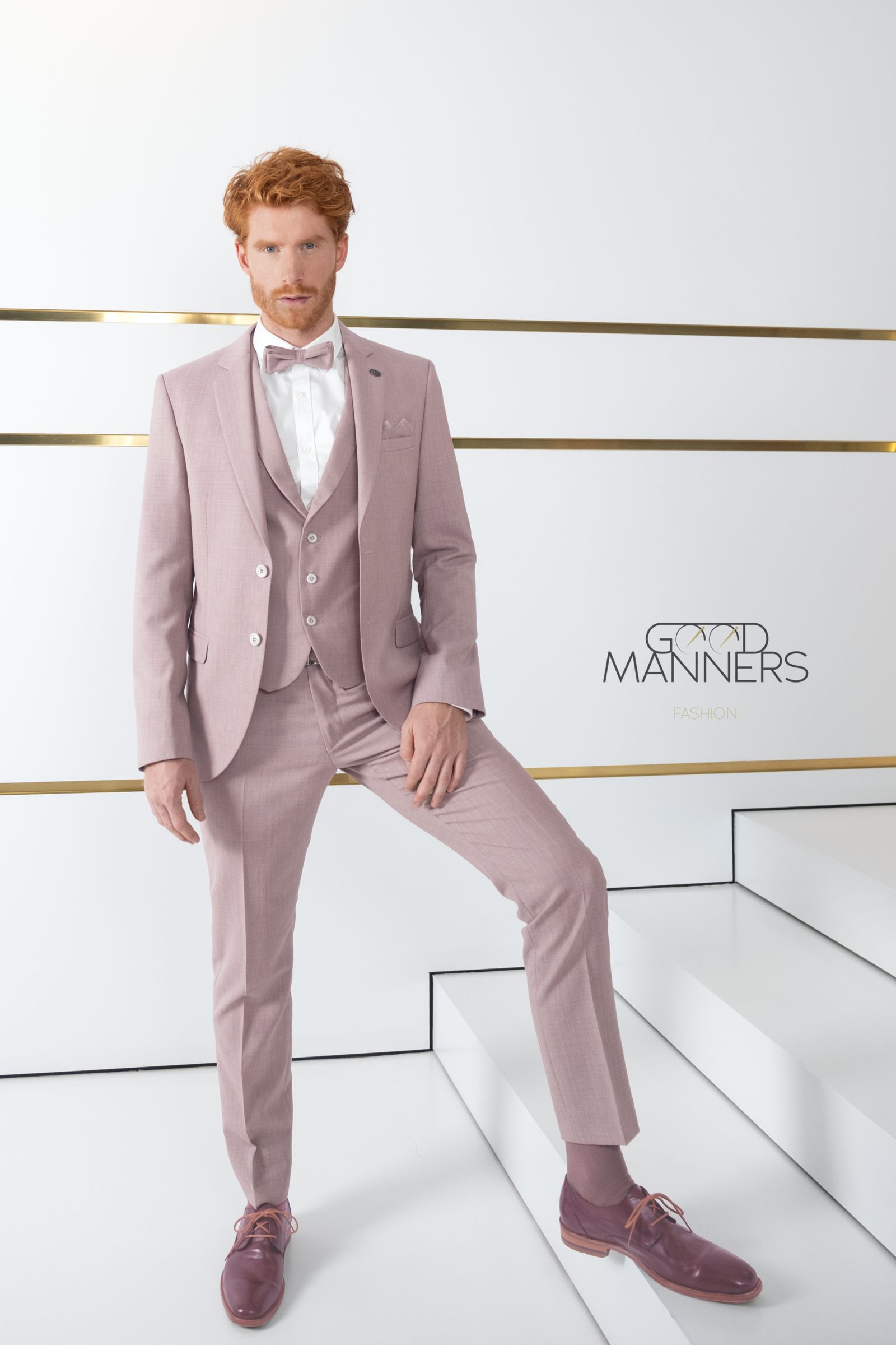 Dit zachtroze kostuum van Good Manners is hét toonbeeld van moderne klasse. De frisse tint, het bijpassende gilet en de stijlvolle vlinderdas geven elke bruidegom een eigentijdse, romantische uitstraling. Perfect voor wie durft te kiezen voor een unieke look op zijn grote dag. Combineer met ton-sur-ton accessoires voor een ultiem harmonieus geheel.